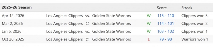 本赛季常规赛,双方交手战绩为:快船3-1勇士(包括今日快船115-110战胜勇士)。